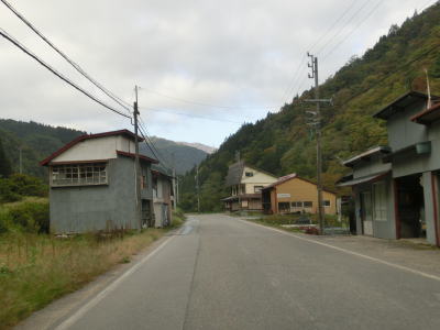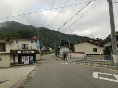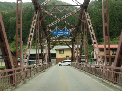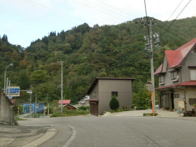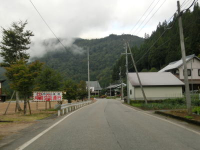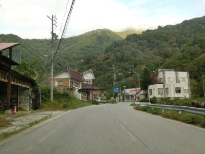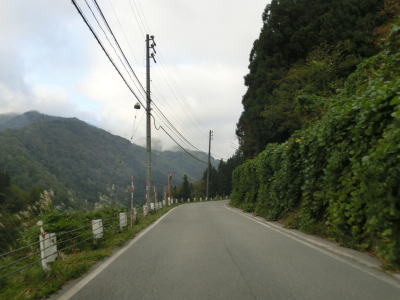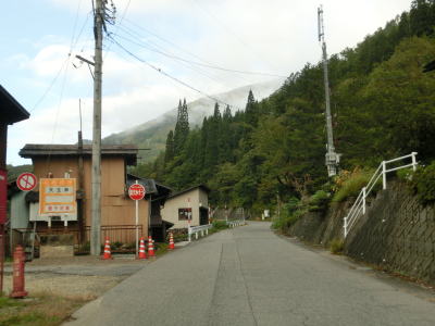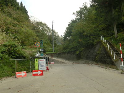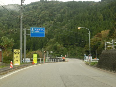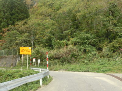 | Y字路を過ぎてすぐに左ヘアピンカーブを曲がり、集落内を走っていると右ヘアピンカーブ、そして左ヘアピンカーブを曲がって一気に標高を上げる。最後の左ヘアピンカーブ付近では工事が行われていたため片側交互通行規制が敷かれていた。天生集落の家屋が途切れる直前に道路情報板が設置されており、そこには「通行注意」とだけ表示されており通行止でない事が確認できた。 | ||