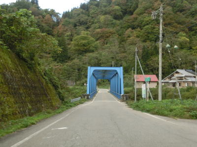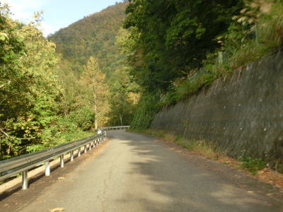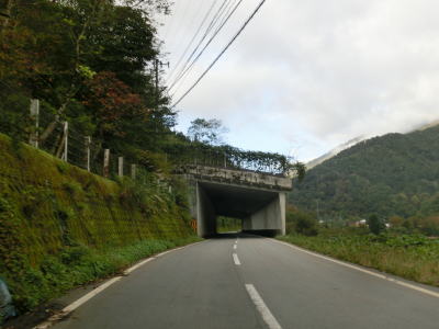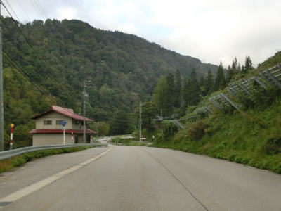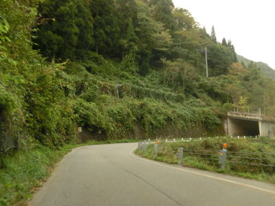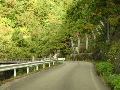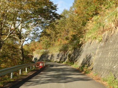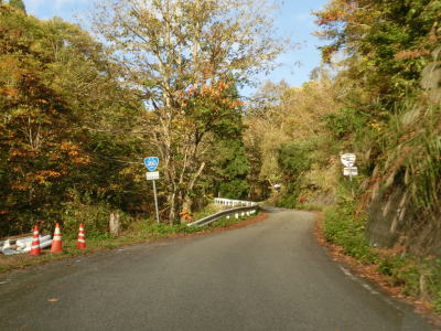 | 閉鎖用ゲートを通過してすぐに左ヘアピンカーブを曲がるが、その後のカーブは緩やかなものとなる。勾配も意外に緩やかだが、標高は既に600mを超えている。道幅は1.5〜1.8車線幅だが、ガードレールが道路中心側に移設されている箇所がある。まだ新しい事から設置されたのはごく最近と思われる。雪解け後も通行止が解除されなかったのはガードレールを設置する工事を行っていたのだろう。工事による通行止が解除されたのが9月25日で、その2週間後の走行であり多少の堆積物は見られるが舗装の状態などは良好である。4ヶ所の連続ヘアピンカーブを通過して少し走ると比較的大きな沢に架けられた橋を左にカーブしながら通過する。 | ||