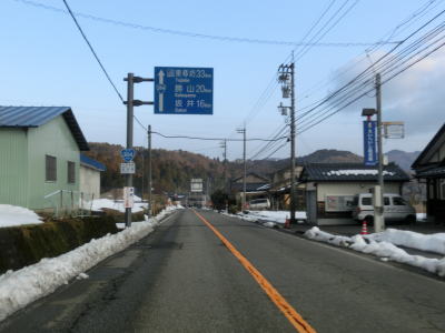 | 案内標識におにぎりは表記されていなかったが、おにぎりはちゃんと残っておりまだ国道として指定を受けているものと思われる。下宇坂小学校の東でR158福井市街と案内された道路との交差点を通過するが、これはR158のバイパスと繋がっている道路である。その後は集落の中を2車線道路で走り抜ける。前述の通り、バイパスが並走している区間のため交通量はさほど多くない。 | ||