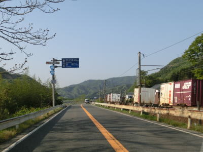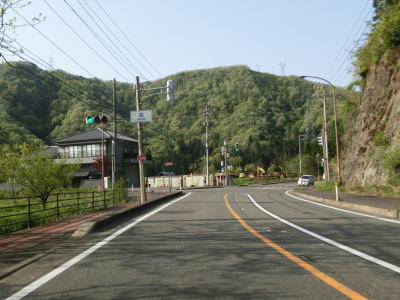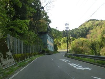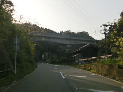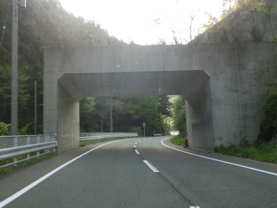 | 梅浦川の支流に沿って走っていると橋の下をくぐり、直後に左にカーブしてもう一度くぐる。その後はやや急な勾配を右にカーブしながら上っていると先ほどくぐった栃尾平橋を渡る。その構造からバイパスである事は容易に想像できるが、急勾配かつ急カーブなためさらに新しいバイパスが建設されている途中である。 | ||
