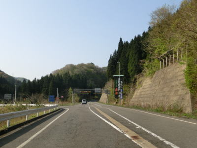 | 八田トンネルを出るとすぐに緩やかな左カーブを曲がり、その先で越前市の境標識の脇を通る。トンネルとは少し離れているが、境標識が立っている場所が市町境でありトンネルは全て越前町域に含まれている。越前市に入ってすぐに集落に差し掛かるが、その中は歩道のないやや狭苦しい2車線道路となっている。沿線の家屋が途切れると同時に平坦かつ直線的な道路状況となる。 | ||