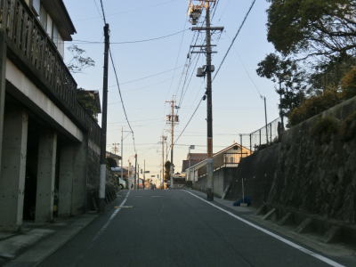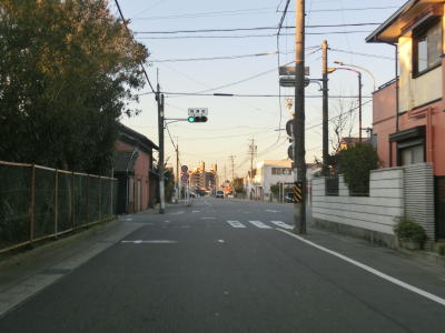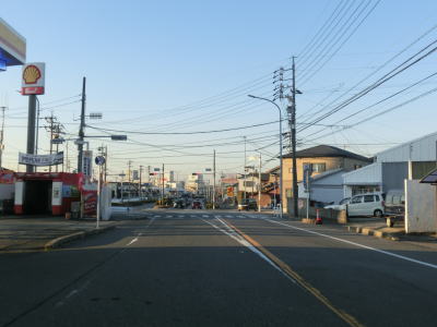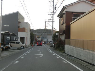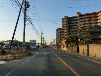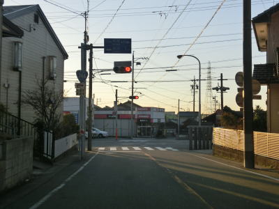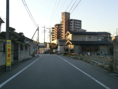 | 下りになってすぐに信号機のない市道との十字路を通過するが、ここから先は南向きの一方通行区間である。一方通行の規制標識が確認できないが、制限速度と駐車禁止の標識の後ろに隠れて見えないだけである。その制限速度と駐車禁止標識の支柱には「この道路は一方通行です」と書かれた看板が立てかけられている。 一方通行区間と言っても比較的道幅に余裕はあり、乗用車同士であれば離合できなくはない。そのまま進んで行くと道幅が若干狭くなり、右カーブを通過した先で愛知r260との亀崎相生交差点に至る。一方通行区間はこの亀崎相生交差点までである。この一方通行区間の交通量は少なくないが、左折の市道へ進んですぐにR247に出るため左折する車両が大半である。 |