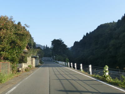 | 保坂交差点からはR303との重複区間が始まる。道路状況に変化はないが交通量が増える。石田川の流域を北上した後に左にカーブして角川橋を渡り、水坂トンネルをくぐる。トンネルを出て少し走ると水坂峠を越える旧道との交差点を通過する。水坂峠は分水嶺の峠でもあり、峠から北を流れる寒風川は北川水系で若狭湾に注いでいる。その北川の支流に沿って走っており、沿線の家屋がないように見えるが川に近い旧道沿いに家屋が建っている。 | ||
