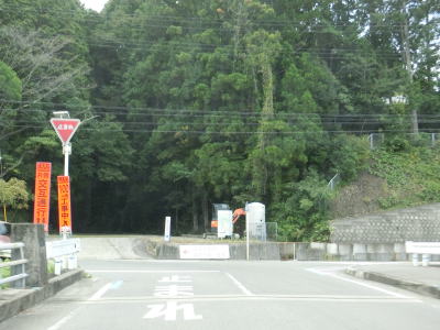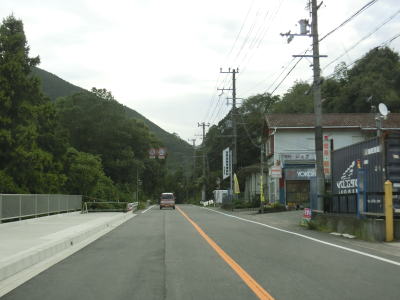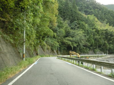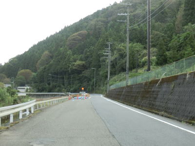 | 俵橋を渡ったすぐ先に貴志川によって削られて崩落しかけている場所がある。片側交互通行規制が敷かれていたが、距離が短く交通量も少ないため信号機を置かなくてもよさそうなものである。上新城集落を過ぎるとセンターラインがなくなって道幅も1.8〜2.0車線幅になる。 | ||