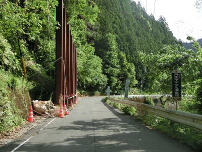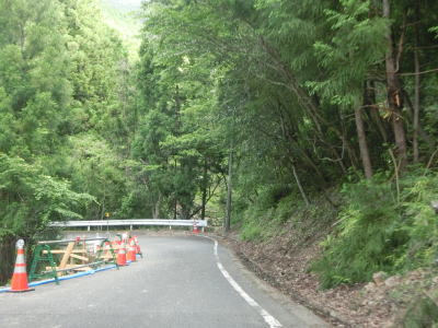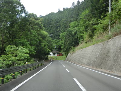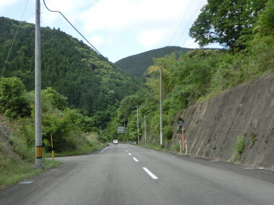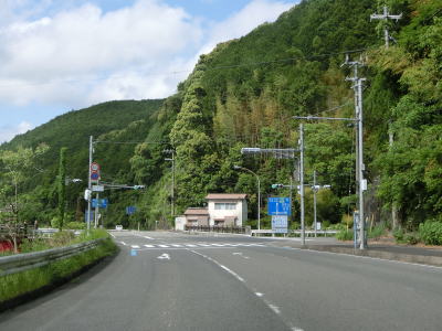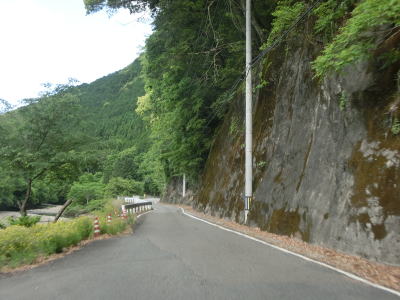 | 朝潮橋を渡った北詰で和歌山r735との交差点に突き当たって右折する。左折すると龍神交差点方面に戻ってしまう。交差点の直後こそ2車線程度の道幅があるが、すぐに1.5車線幅と狭くなってしまう。法面は脆いようで複数の崩落もしくは崩落予備箇所が存在していた。 | ||