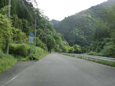 | 法面の崩落箇所を通り過ぎた後に小松原集落への市道との交差点を右にカーブしながら通過する。中川の右岸の狭路を走るが、一部は改良されて2センターライン付きの2車線道路になっている。 | ||