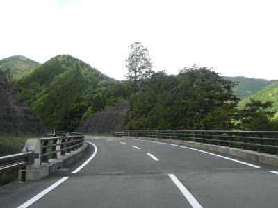| 長い上り勾配が続いており多くの橋梁を通っており、その中の東谷橋を渡り終えた先でバイパス供用以前の迂回路だった市道との交差点を通過する。この龍神四バイパスが供用された事によって分断区間の解消には至っていないが、酷道区間の短縮には貢献している。 | ||