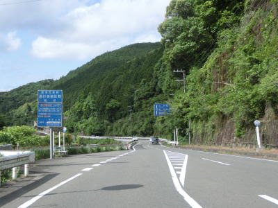| 鍛冶屋川口交差点からは異常気象時通行規制区間に入る。対象区間の延長は6kmで、連続雨量200mを超えると通行止になる。とは言え道路状況は引き続き2車線道路で走りやすいといえる。滝尻隧道を出た直後のR311来栖川交差点を左折してとの短い重複区間が終わる。 | ||