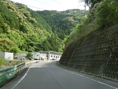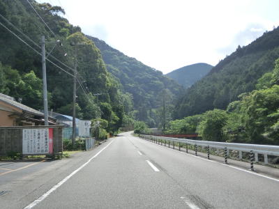 | 地蔵峠から下っていると程なくして串崎集落を通り抜け、次いで中切集落、下地集落を通る。集落内は1.0車線幅で離合できない箇所も存在している。巨鼇川に香ノ川が合流する地点で市道(林道?)が交差している右カーブを曲がる。案内標識は設置されていないが、道なりが国道なのでルートミスする可能性は低いだろう。 | ||