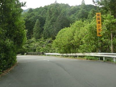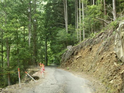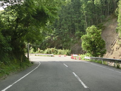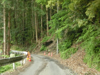 | 田ノ瀬集落を過ぎるとしばらく集落のない状態となる。その区間に路肩と法面が崩れかけている場所を通るが、ロープで結ばれたポールにカラーコーンが置いてあるだけでである。大雨でなくともさらに崩れて通行止になってもおかしくない状態であった。 | ||