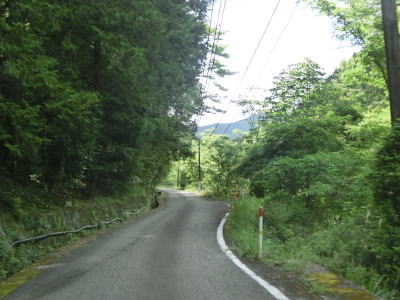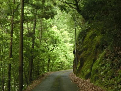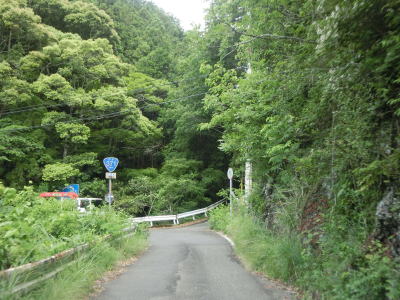 | 中村集落からは道幅がさらに狭くなって1.0〜1.5車線幅道路になる。法面はもちろんのこと舗装面にも苔むした場所が存在している。これだけ見ると交通量は少なそうだが、奥に複数の集落があるため意外に多くの対向車に出くわす。地ヶ谷橋を渡ると集落が途切れ、緩やかな勾配を上った先で地蔵峠を越える。 | ||
