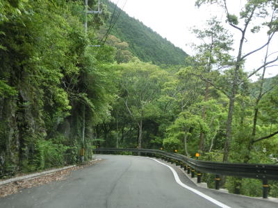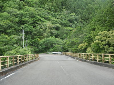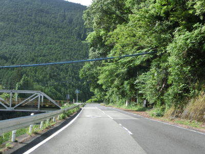 | 交通量の少なそうな山岳部の酷道区間だが、走行した日は意外に多くの対向車と出くわしており離合可能なスペースまで後退するのも1回や2回ではなかった。常に離合できる場所を頭に入れながら走行する羽目になってしまい、神経をすり減らす走行となった。道幅が広くなって安心しそうになるが、箱渕橋を渡り終えるとすぐに狭くなってしまう。 | ||