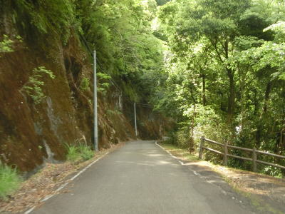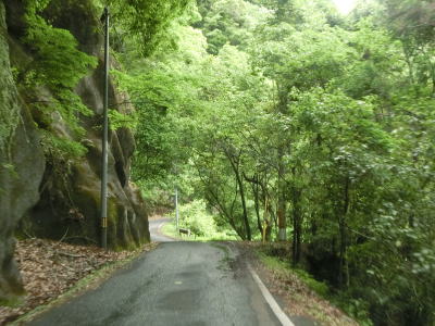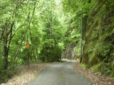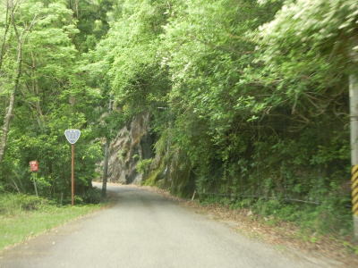 | 道幅は広くて1.5車線幅、狭いと1.0車線幅である。その状態が長距離に渡って続く。鬱蒼とした場所もあれば日が差し込む場所もあるが、道幅が狭い点において変化はない。路肩が崩落しかけている場所もあり、鉄板が敷かれており「最徐行」という立て看板が設置してあった。 | ||