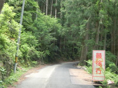 | 和歌山r37交差点の直後に1.5車線幅の三川大橋を渡って右カーブを曲がり、さらに左のヘアピンカーブを曲がる。合川貯水池に沿ったカーブの多い狭路を走っていると大峯集落を通り抜ける。 | ||