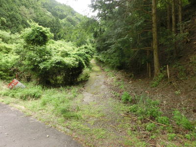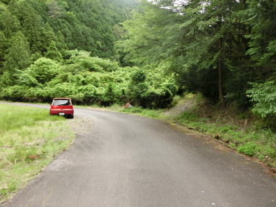 | 木守橋南詰の交差点を過ぎるとその奥に集落が存在しないせいもあって路上の堆積物が多くなる。轍部分に堆積物がない事から全く車が通らない訳ではなさそうである。鬱蒼とした場所から日が差し込んで少し広いスペースのある場所に出る。左カーブの外側に0.8車線幅の狭い道路が接続しているが、その道路がR371の点線区間である。よって車両で通行できる区間の端点と言える。点線区間を少し見てみると軽トラックであれば傷や汚れを気にしなければ多少進入できそうだが、古座川町まで通り抜けるのは不可能である。 | ||