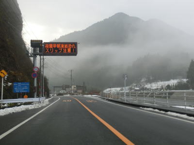 | 短い加速車線から本線に進んですぐに志戸坂トンネルに入る。対面2車線のトンネルで高速道路であればラバーポール等が設置されているのだろうが、高速道路に見える一般道路なのでキャッツアイだけしか設置されていない。そして南向き車線側には歩道が設置されている点も高速道路とは異なる。全長1630mの志戸坂トンネルの中に県境があり、トンネルを出ると岡山県と西粟倉村の境標識が設置されている。 | ||