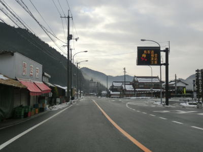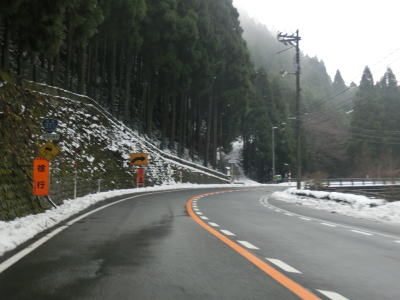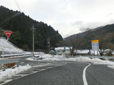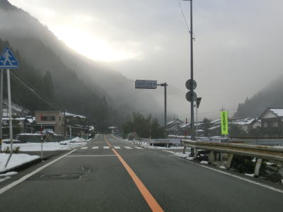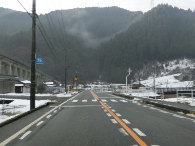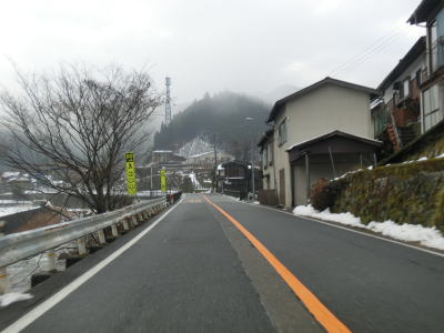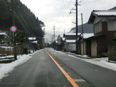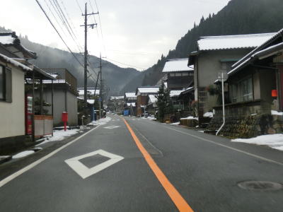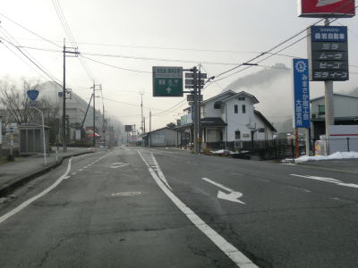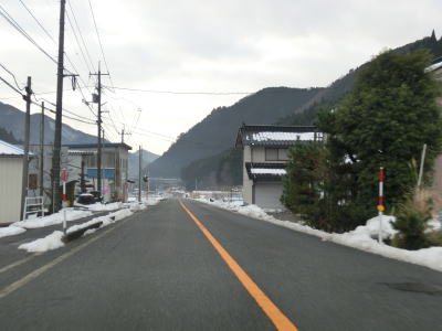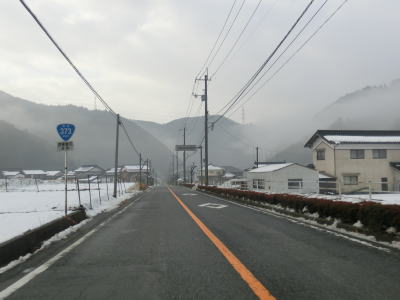 | 村の中心部を通過してからも集落が続いているが、家屋の密集具合は中心部ほどではない。智頭急行と鳥取道に挟まれた状態で吉野川の左岸を走っていると智頭急行の江原トンネル、鳥取道の筏津トンネルの手前で右にカーブして鳥取道をくぐる。粟倉木屋原大規模林道との交差点を左にカーブしながら通過した先で美作市に入る。 | ||