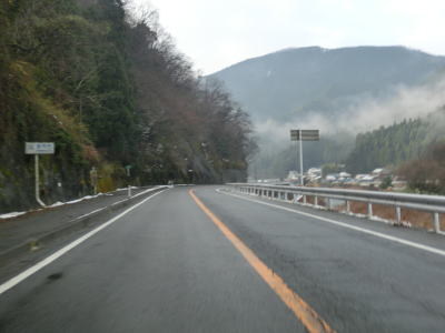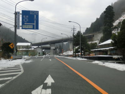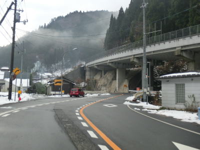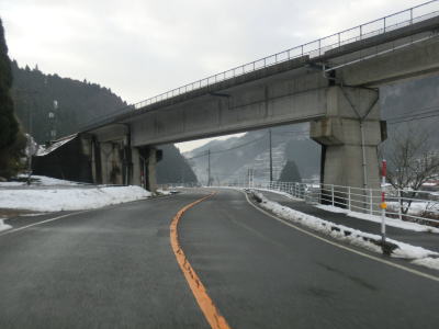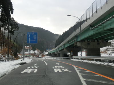 | 智頭東交差点を通過してR53から分岐してR373単独区間となっても道路状況に大きな変化はない。千代川の右岸を走っていると智頭町の市街地を通り過ぎ、沿線の家屋の数が少なくなる。篠塚集落の東で2つの高架が視界に入ってくるが、右側の低い高架が智頭急行で正面の高いものが志戸坂峠道路の高架道路である。R373だけでなく志戸坂峠道路と智頭急行も千代川流域を走っている。 | ||