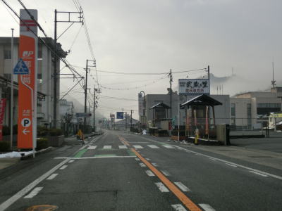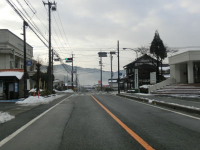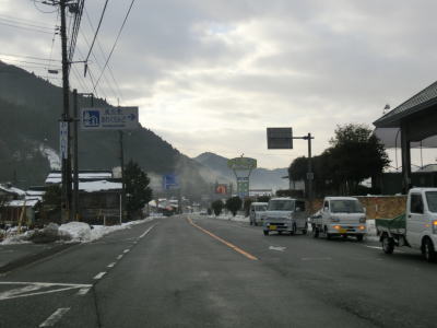 | 43.桜並木の直線道路 | 44.智頭町の中心部を抜けると家屋の密度が低くなる | 45.正面は志戸坂峠道路、右は智頭急行 |