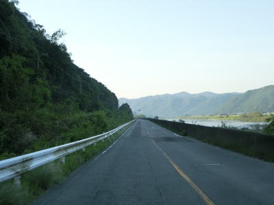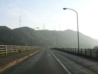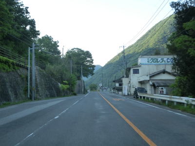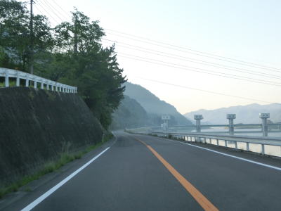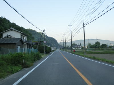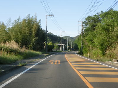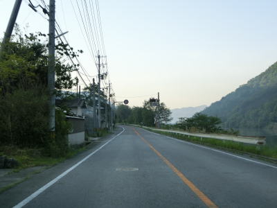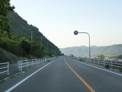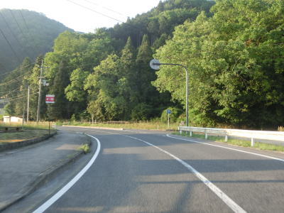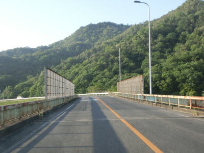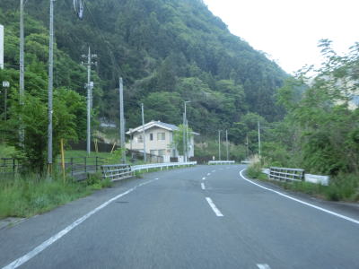 | 吉井川の左岸の2車線道路を快走する。川と反対側の少し高い位置に歩道のようなものがあるが、これは片上鉄道跡を転用した自転車道、つまり岡山r703である。杖谷駅跡を通過し、吉井川に沿って左カーブを曲がった後に苦木集落を通過する。集落内ではr703の方が低い位置を通っており、その北に家屋が存在している。 | ||