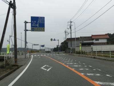 | 日山橋を渡り終えた所でR54・R184・R433・R434日山橋東詰交差点に突き当たる。案内標識にはR54しか表記されてないが、R54松江方面にR184が、R54広島方面にR184とR375とR433とR434が重複している。5本もの国道が重複しているが、これまで同様に串刺しおにぎりは設置されていない。 日山橋東詰交差点から200mも走らないうちに尾関大橋北詰交差点に至り、左斜め前方に進むとR54・R184から分岐する。R433とR434は重複したままだが、上位国道優先の法則から案内標識にはR375が表記されている。 |