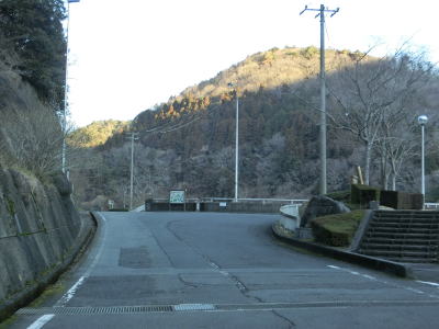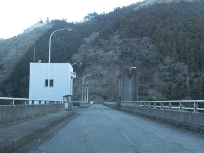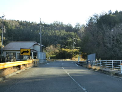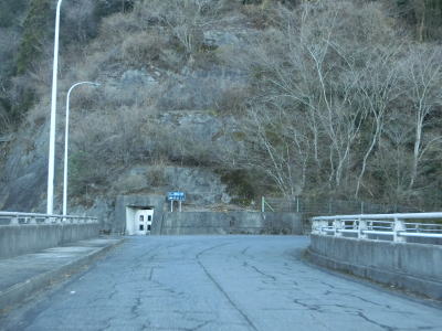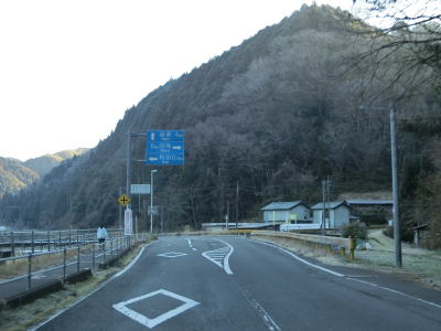 | 島地川ダムの西で右直角カーブを曲がってダムの天端を通り、東でも右直角カーブを曲がる。ダムの西側には案内標識が設置されていないが、交差点の路側帯を示す破線がかろうじて見えるため右に進む事が分かるだろう。逆方向の走行であれば手前に案内標識とともにおにぎり下の補助矢印標識で左に進む事が分かる。 | ||