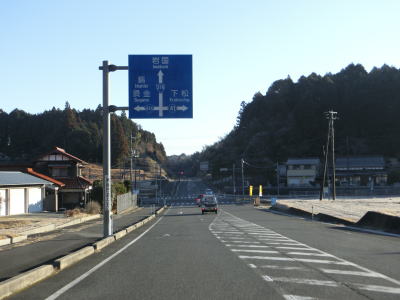 | 山口r142交差点を過ぎてすぐに7%の下り勾配が始まる。酒造会社の前を通り過ぎてから長野大橋を渡る。橋上からは右前方に集落が確認でき、高低差がかなりある事が分かる。 左にカーブしてから大きく右にカーブして勾配を下り切った所でR2西長野郵便局前交差点に突き当たる。岩国市の市街地からは20km以上離れたこの交差点がR376の終点である。前述のとおり、岩国市の市街地からは離れているが、制定された当時の周東町の市街地からの距離は4km程度と近い。 |