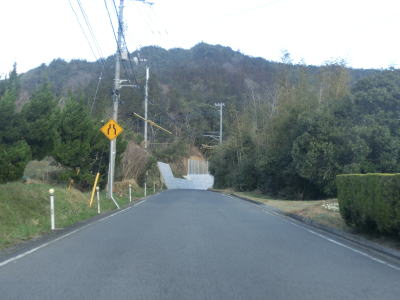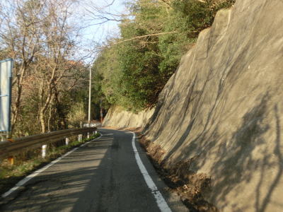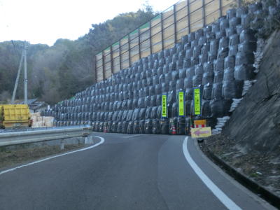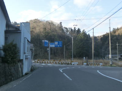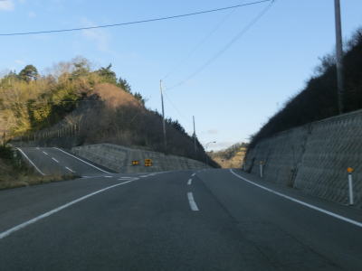 | 五名ダム付近は狭くても1.5車線幅程度だったが、車両通行制限区間に指定されているだけあって1.0車線と非常に狭く乗用車同士の離合もできない。右のヘアピンカーブを通過するが、カーブ部分だけ広くなるケースが多い中ここは大して広くならないままである。ヘアピンカーブの直後に本尊地蔵菩薩地蔵堂を通過し、さらに1.0車線狭路を走る。およそ200m強の狭路区間の終わりは大量の巨大土嚢が出迎えてくれる。これは狭路区間をパスするトンネル(?)工事の現場である。なお、ウォッちずではヘアピンカーブ部をショートカットするトンネルが描かれているが、2016年3月時点においてそんなものは存在しない。 | ||