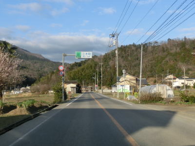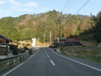 | ヘアピンカーブを含む短い狭路区間が終わると再び2車線快走路が続いている。日開谷川の支流の大影谷川の左岸の山裾を走っており、沿線には少ないながら家屋が点在している。払川自治会館の前を通り過ぎると上り8%勾配の標識が立っており、その奥に急勾配の道路が見える。しかしこれは旧道であり2012年7月24日に開通したはらいがわトンネルを含むバイパスはさほど急な勾配ではない。 | ||