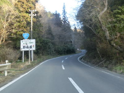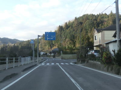 | 道幅が狭くなった直後に警笛鳴らせ規制区間が始まる。道幅が狭く見通しが悪いため設置されている標識だが、規制区間内にも家屋が存在しているので鳴らすのは憚られる。道幅は狭いものの乗用車であれば互いに減速すれば離合できる程度の幅は確保されている。五名橋を渡って家屋を通り過ぎるとさらに幅員減少の標識が現れて、以降は1.5車線幅になり緩やかな勾配を上る。 | ||