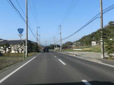 | 須賀交差点から極緩やかな勾配を上り、下りに転じて下り切った所でR11・香川r245姫浜交差点に至る。起点も終点もR11との交差点だが、両地点の距離はR377の120kmに対しR11は118kmと意外にも大きな差はない。これはR11が海沿いの大回りとなるルートを取っているためである。なお、R11は高松市の中心部を通り抜けているなど幹線道路のため交通量が非常に多い。 | ||