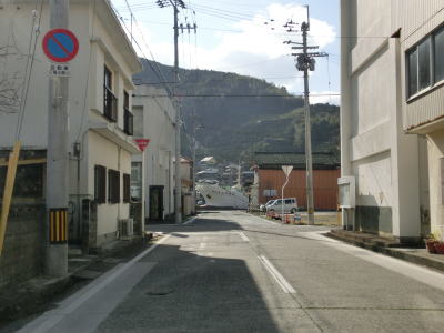 | 直角カーブの直後は車線にすれば3車線分はあろうかという道幅だが、50m程先で一気に狭くなった後に右直角カーブを曲がる。1.5車線幅の道路を約70m進んだ所で市道とのT字路に突き当たり、一時停止してから港に沿うような形で右折する。カーブを含み右左折が多いが案内標識は一切設置されてない。 | ||