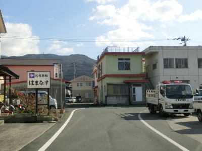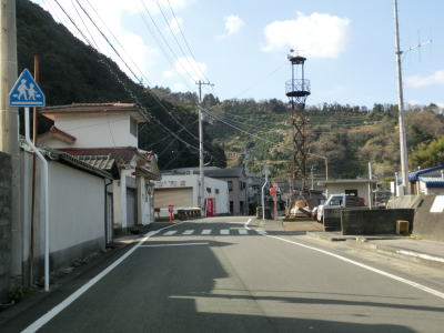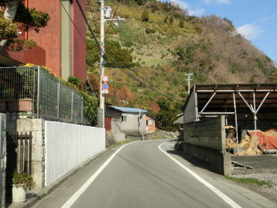 | 1.5車線程度の狭い道路で明浜町田之浜集落を走り抜ける。これまでに通過してきた多くの集落と同様に沿岸部の集落だが、東端付近に崖があり落石注意の警戒標識が設置されている。集落を通り過ぎた直後に2車線道路になるが、500m走った所で狭くなってしまう。以降は1.5〜1.8〜2車線と道幅がコロコロ変わる状態になる。道幅の広狭に関わらず急カーブが多い。 | ||