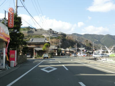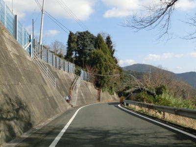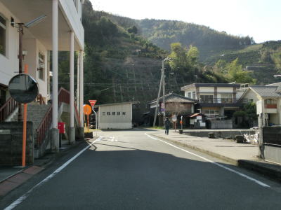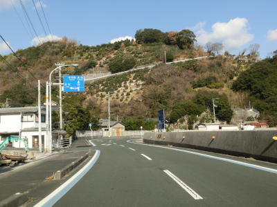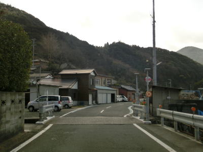 | 愛媛r30・r26との交差点を無事右折してセンターライン付きの2車線道路を70m程走った所で市道との十字路を通過するが、国道側に一時停止の義務がある。十字路を過ぎるとセンターラインがなくなるものの道幅は2.0車線程度あるので乗用車同士の離合に難儀する事はないだろう。十字路から約60mで岸壁に突き当たって左の直角カーブを曲がる。 | ||