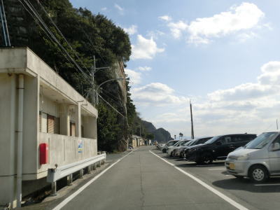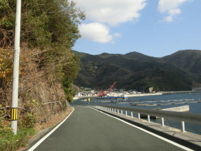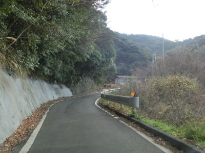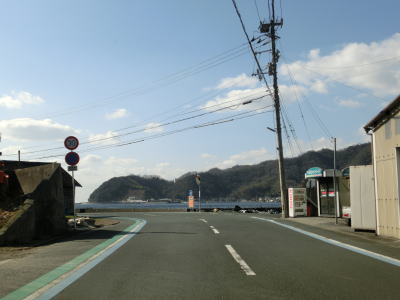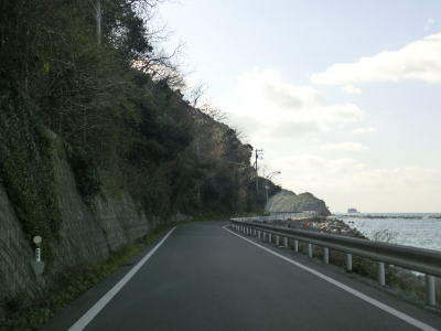 | 市道とのT字路の直後はセンターラインがあるもののすぐ先のS字カーブからは1.8車線幅狭路になってしまう。いくつかの急カーブを曲がった後にセンターライン付きの2車線道路になるが、左カーブを曲がって海沿いを少し走ると再び狭くなる。 | ||