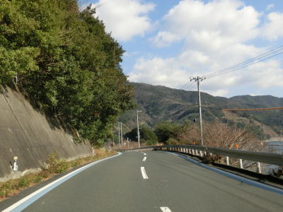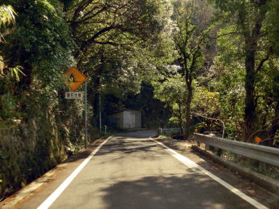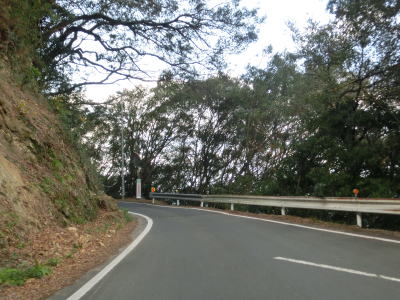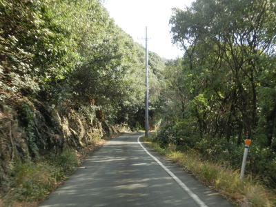| 見通しの悪いカーブが連続する1.5車線狭路をひたすら走らなければならない。写真では海が見えないため海岸線から離れた山間部に見えるが、多少内陸に入っているものの標高は100mを超えており、樹木さえなければ海が見える場所を走っている。 | ||