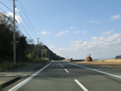 | 直線的な2車線道路を走っていると工事現場を通過する。法面防護工事が行われている様子だったが、後に道路拡幅工事が行われる可能性もある。狭い割に交互通行規制が敷かれていない工事区間を過ぎると比較的新しい舗装の2車線道路を走る。すぐにセンターラインがなくなって道幅も狭くなるが、珍しく狭路区間の距離が短くセンターラインが復活して辰が崎を大きく左にカーブして通過する。 | ||