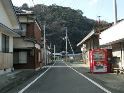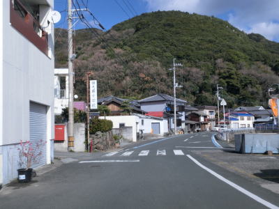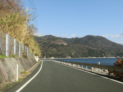 | 岩井集落を過ぎると1.5車線幅の狭路に戻る。標高20m前後とさほど高くないが海岸線に沿って走っているため眺望は良い。500m弱の2車線道路を走った後に左にカーブすると1.5車線幅になり、その状態で宮之串集落を通り抜ける。 | ||