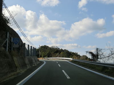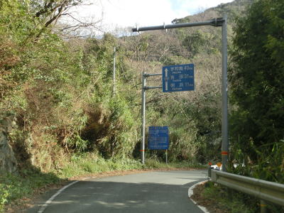 | やや急な右カーブを過ぎると異常気象時通行規制区間に入る。対象区間の距離は17.6kmで、時間雨量30mm、連続雨量200mmという雨の規制に加えて、風速15m以上という規制値がある。規制区間に入ってからも狭路が続いているが、1.5〜1.8車線幅と僅かに広くなっていると言える。ミカン畑の間を走りながら緩やかな勾配を徐々に下って行く。 | ||