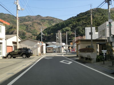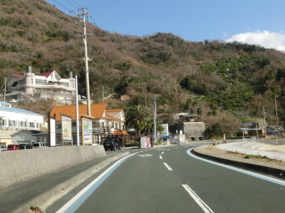 | 本浦集落と枝浦集落を相次いで通過するが、これらの集落は西予市明浜町狩浜に属しており、No.140の写真の地点から始まった異常気象時通行規制区間の終点でもある。枝浦集落を完全に通り過ぎると道幅が広くなりセンターライン付きの2車線道路になる。相変わらずカーブが多いものの概ね走りやすい道路状況である。 | ||