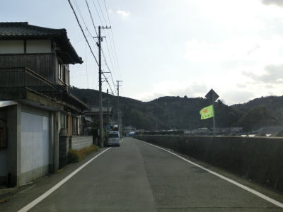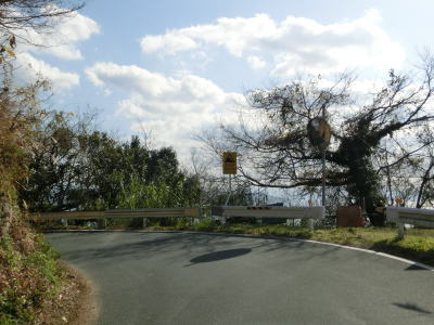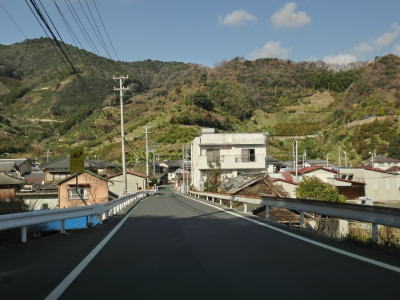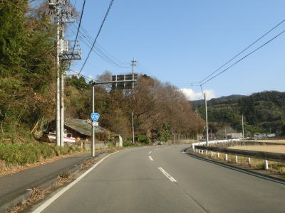 | 比較的長い2車線区間が終わると道幅が狭くなる。部分的に拡幅された場所もあるが基本的には1.0〜1.5車線幅の狭路が続いている。センターラインが復活して以降も急カーブが多い。慰霊塔が立っている前を左のヘアピンカーブで通過し、右左の急カーブを曲がった後に集落に入る。 | ||