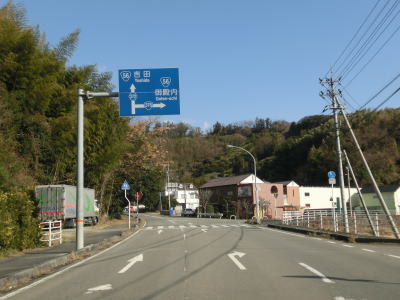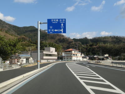 | 愛媛r272交差点を右折してからも2車線道路が続いているが、300m程走った所でセンターラインがなくなり1.5〜1.8車線幅になってしまう。御殿内集落の家屋と山に挟まれた間を走り、センターラインが復活し少し走るとR56御殿内橋東交差点に至る。交差点の手前の本村川に架かっている橋が御殿橋だが、非常に短い橋である。 伊予市と宇和島市(旧吉田町)とを結ぶ国道で、起終点ともにR56との交差点となっているが、内陸部を走るR56に対してR378は概ね海岸沿いを走っている。そのためR56の72kmに対してR378は122kmとかなりの差がある。狭路が多い事からもR56の代替路としての機能は一部の区間を除いてほとんど持っていないと言える。 |