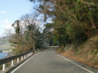 | だけの鼻の根元を左にカーブするとセンターラインがなくなり、その状態で明浜町渡江集落に入る。緩やかな勾配を下り切った後は湾に沿って右にカーブする。集落を通り過ぎると渡江トンネルに入るが、その手前からセンターライン付きの2車線道路になる。 | ||