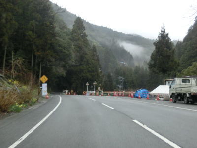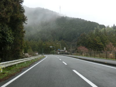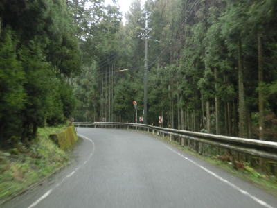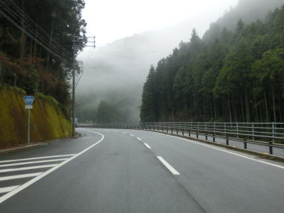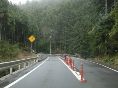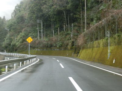 | 道幅が狭い区間が続く割に制式の待避所は設置されておらず、カーブ部分の少し広くなっている場所などで離合をする必要がある。快走路区間ですら交通量が少なかった事もあり真弓峠区間の交通量も極めて少ないため、油断していたら材木搬出用のショートタイプの大型トラックが対向車として現れた。 | ||