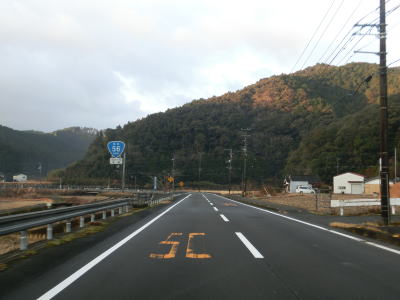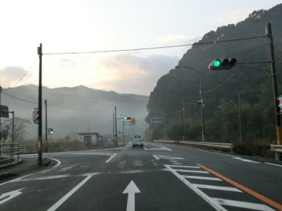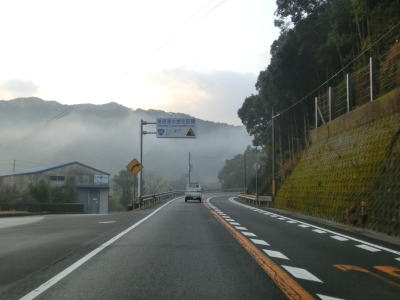 | 久礼坂第四トンネルを出てからは上り勾配は相変わらずだが直線的な道路状況となっている。大坂谷橋を渡り、右に左にカーブした先で七子峠を越えて四万十町に入る。峠には駐車スペースと茶屋があり、四万十町川には高知r41が交差している。r41との交差点も2ヶ所目だが、R381(実質R56)に比べて内陸側を通っており、旧大野見村の中心部を結ぶ機能がある。なお、四万十町の境標識がr41交差点より南に設置されているが、町境そのものは峠にある。 | ||