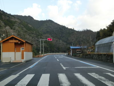 | 桃源跨線橋からしばらくは平坦な2車線道路だが、石内川から離れると同時に上り勾配となる。勾配自体はそれほど急ではないが、急カーブが多く集落内を通っている事もあってやや走りにくさを感じる。路面に排水用の溝が掘られており、2輪車の走行に注意を促す看板が設置されている。もっとも交通量が多いせいか、轍部分の溝はほとんど残っていなかった。 勾配が若干緩やかになった所で町境を通過して鬼北町に入る。やや急な勾配を下るが、カーブは緩やかなので松野町側に比べると走りやすい。JR予土線が近付いてきた辺りで勾配がなくなって平坦になる。 |