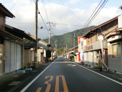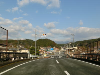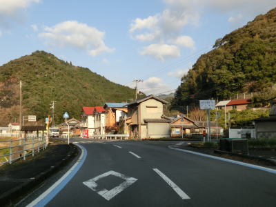 | 視界が開けて吉野集落が見えた所でS字カーブを描きながら勾配を下る。このカーブの東側にだけセンターラインが描かれている。平坦になると家屋が密集した集落内を通っており、直線で見通しが良いものの制限速度は30km/hに設定されている。吉野集落の南西部で広見川にかかる吉野橋を渡る。下流側に歩行者用の橋が架けられているが、車用の橋は離合困難な幅しかない。 | ||