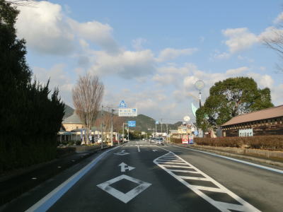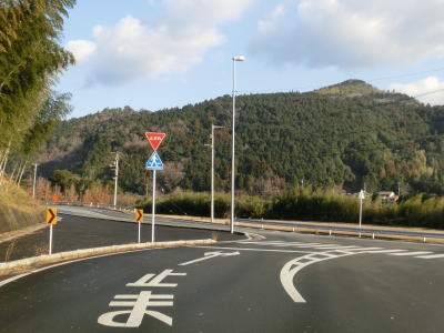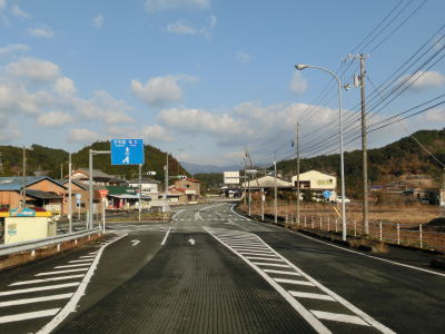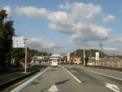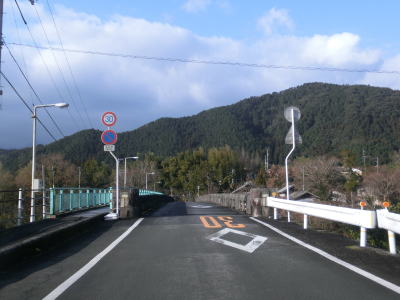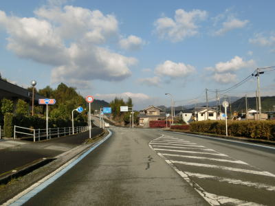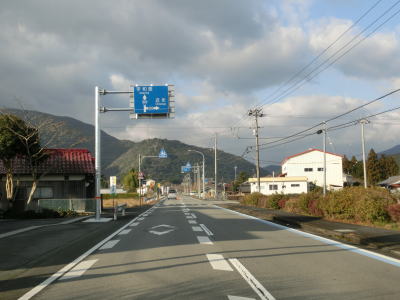 | 吉野橋を渡り終えた直後に右直角カーブを曲がるが、そこからはセンターライン付きの2車線道路になる。ウォッちずで現役扱いされている事もあっておにぎりも残っており、案内標識の中にもおにぎりが表記されている。その後、右にカーブした先で松野東バイパスとのT字路に突き当たる。案内標識は設置されていないが、左折する事でバイパスに合流できる。 | ||