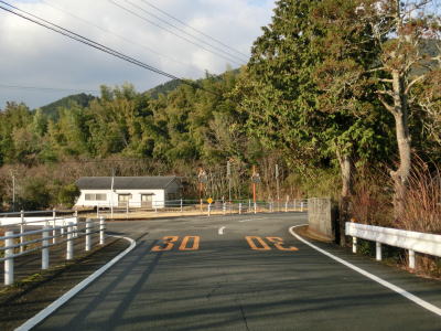 | 愛媛県に入ってから約600m走ると幅員減少の警戒標識が立っており、その先で1車線分狭くなる。狭路区間の道幅は1.0〜1.5車線程度で、乗用車同士の離合も難しく、大型車同士であれば不可能と思われる。距離は500m弱とさほど長くない。 | ||