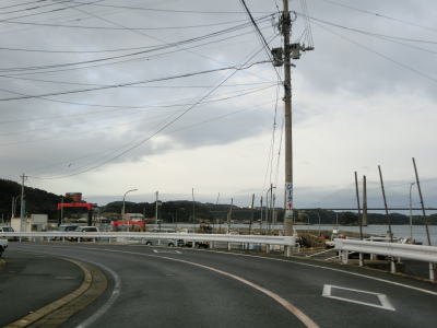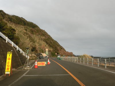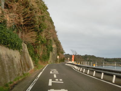| 湊町集落を出ると緩やかな勾配を上って海沿いの少し高い位置を走る。法面崩落のため片側交互通行規制されていた場所を通り過ぎるとセンターラインのない1.5車線幅道路になってしまうが、その距離は100mに満たない。 | ||